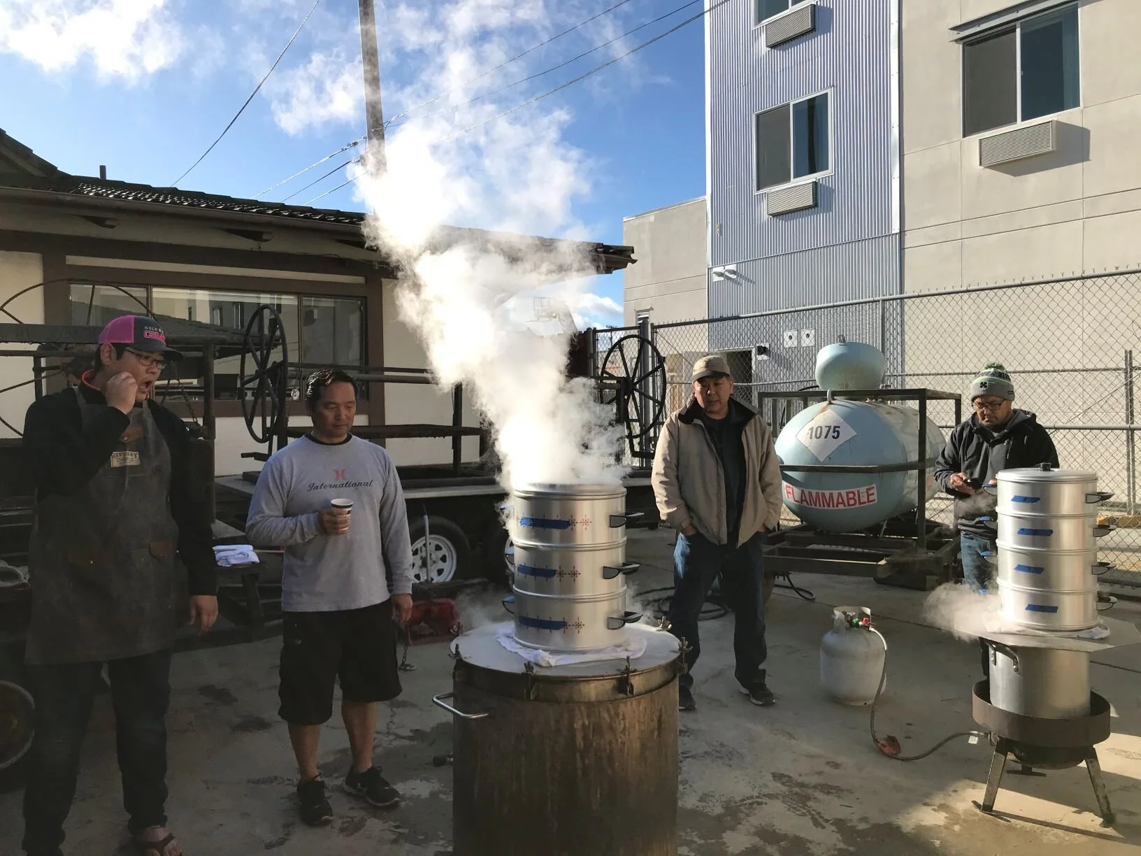 The rice steaming crew. They start the burners before dawn and steam the rice to the perfect tenderness.