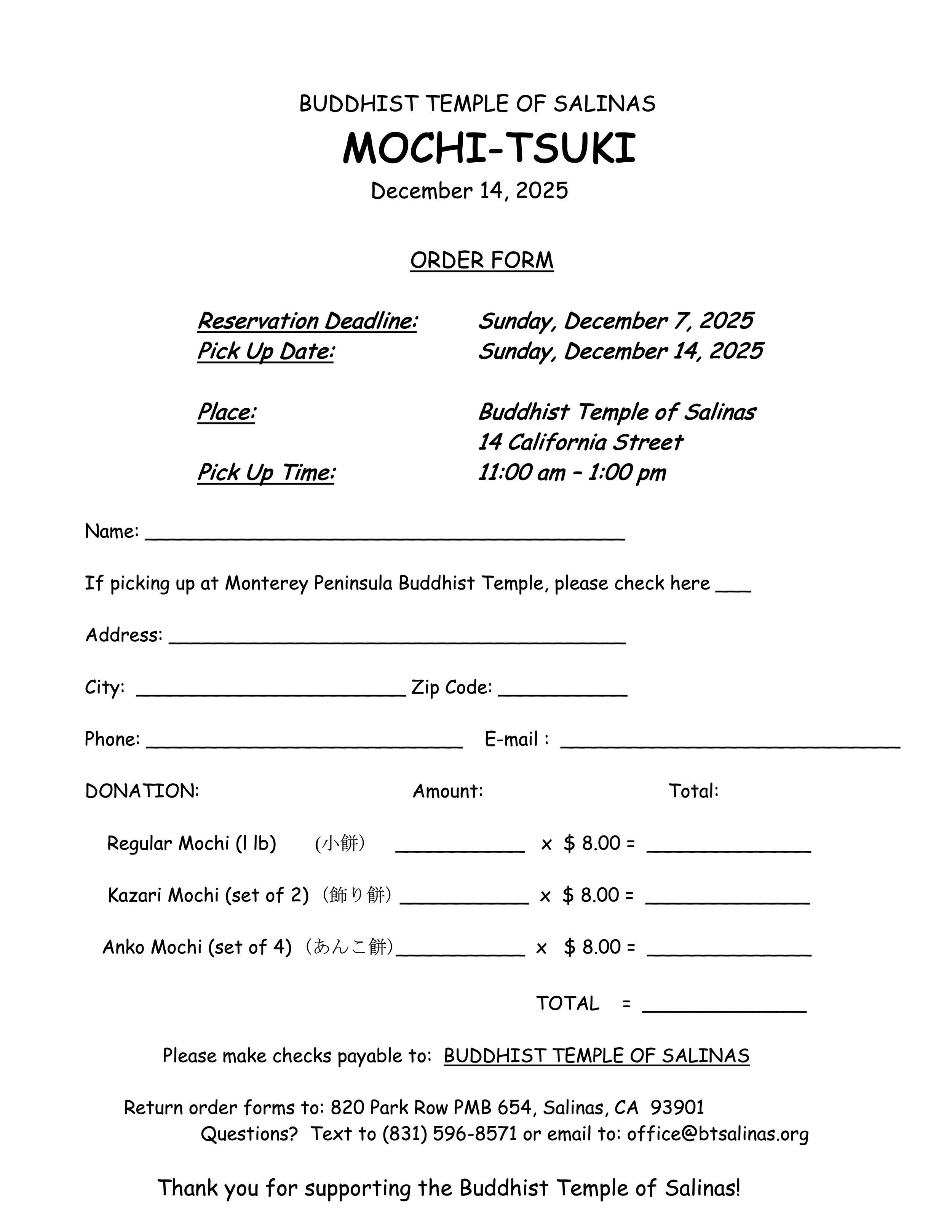 December 14, 2025 (Sunday) Mochitsuki. Mochi making begins at 7 am. Pick up time for orders is 11 am to 1 pm.